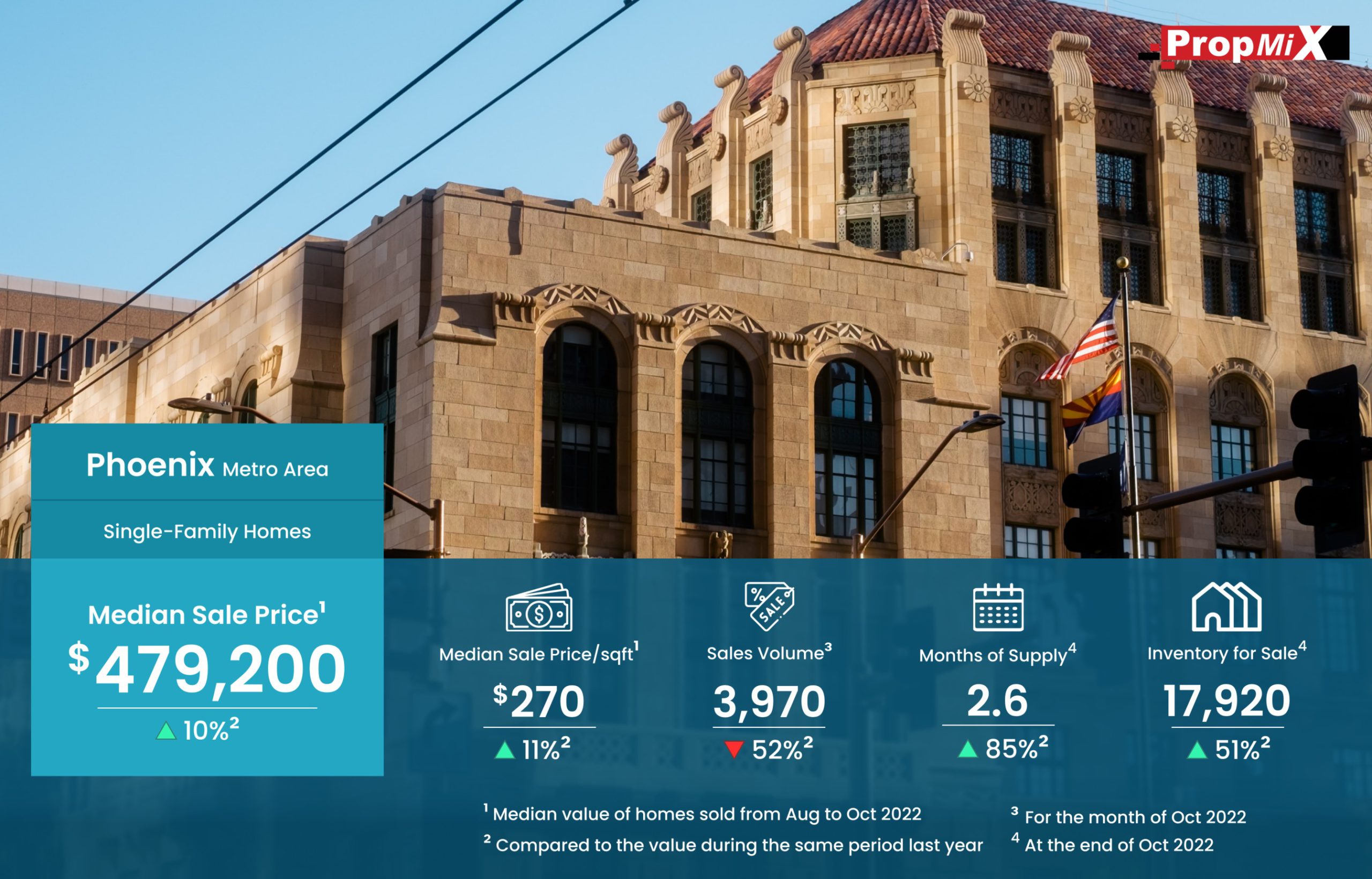 The median sale price of single-family homes sold in the Phoenix metro area was $479,200 for the period from August to October 2022, up by 10% year-over.