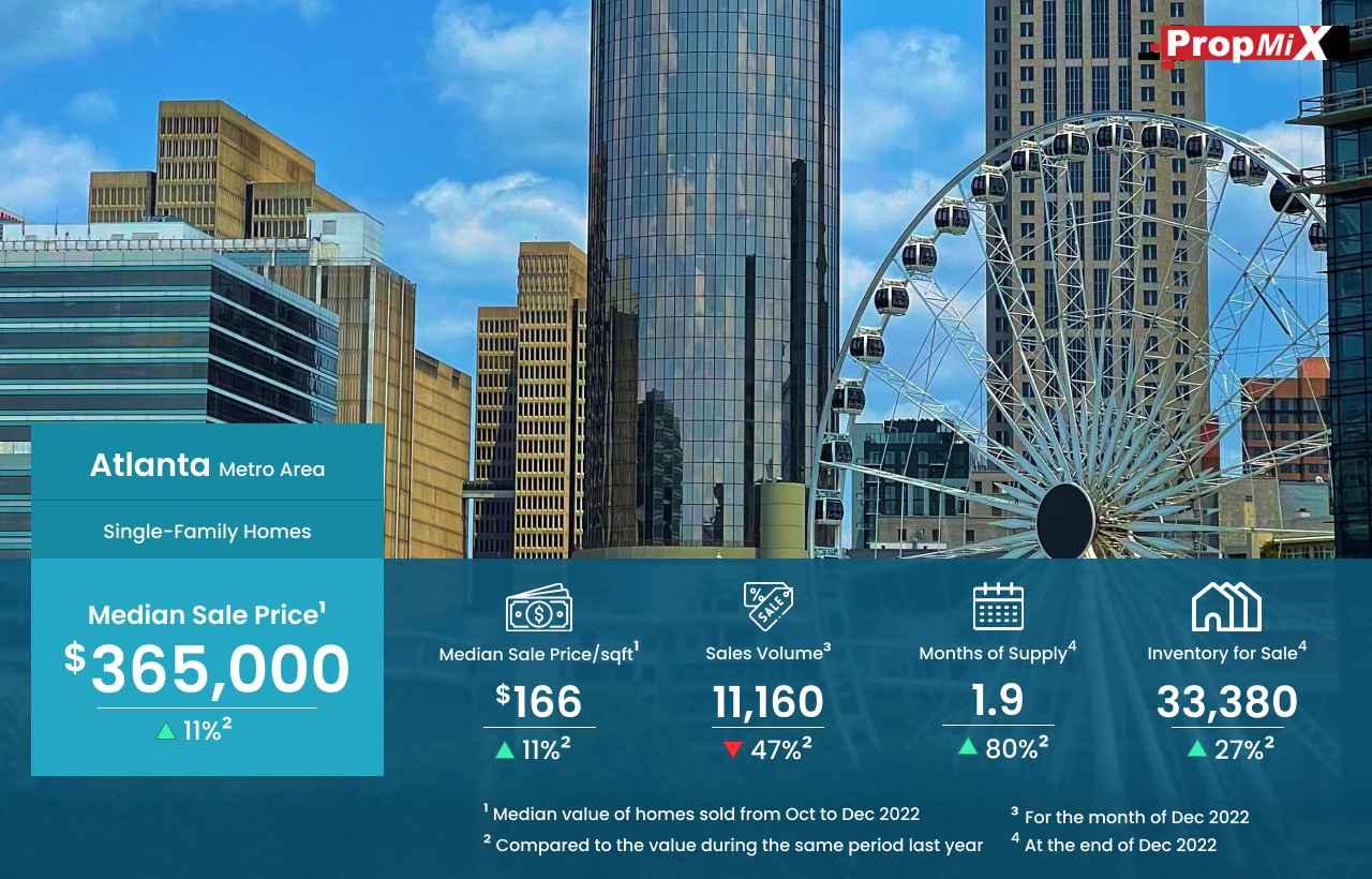 The median sale price of single-family homes sold in the Atlanta metro area was $365,000 for the period from October to December 2022, up by 11% year-over-year.