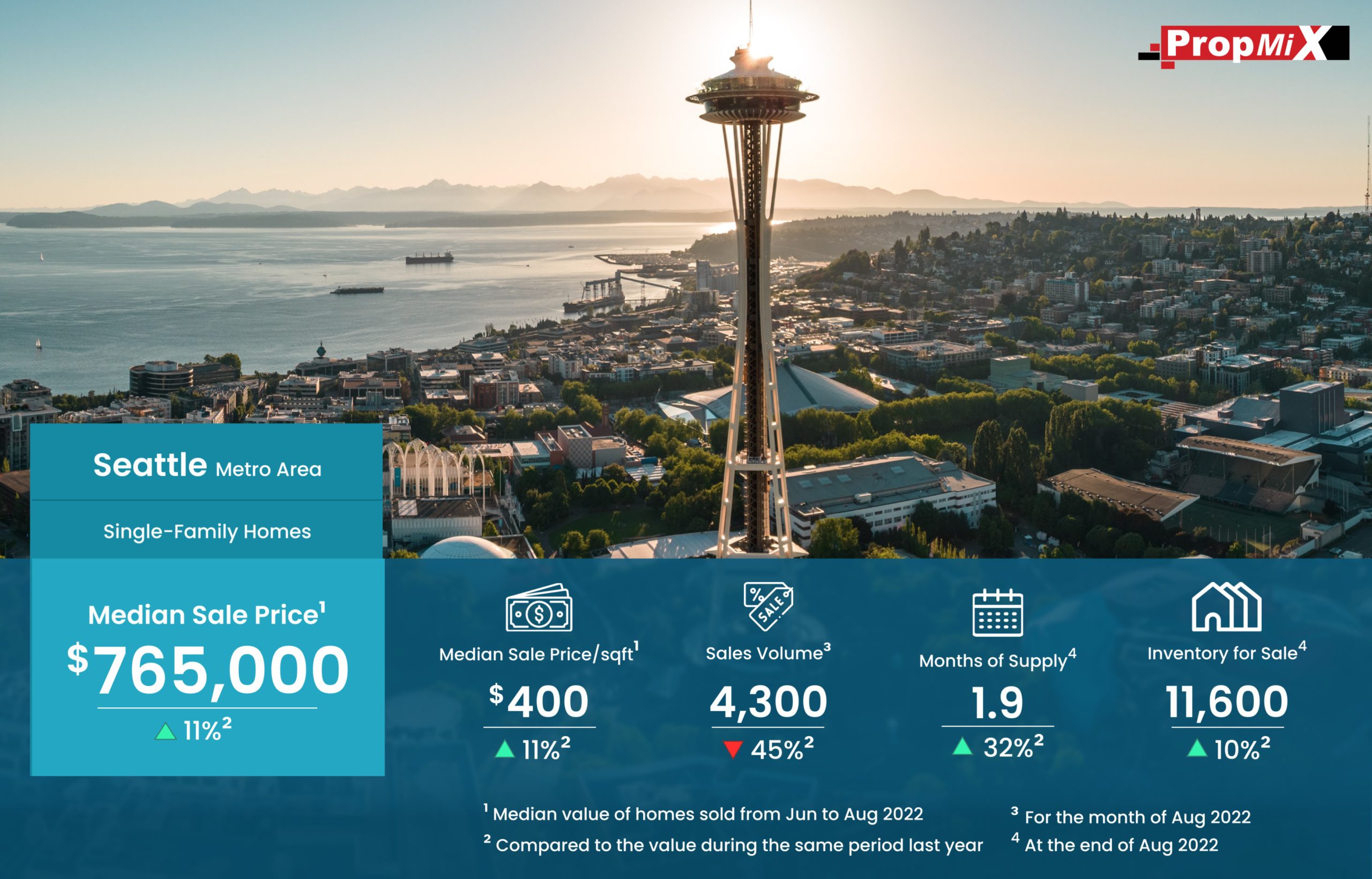 Median Sale Price Up by 11% in Seattle Metro Area in August 2022 09/17/2022 PropMix Data Analytics Team Market Insights 0 The median sale price of single-family homes sold in the Seattle metro area was $765,000 for the period from June to August 2022, up by 11% year-over-year. Learn more about the metrics in PropMix Market Insights.