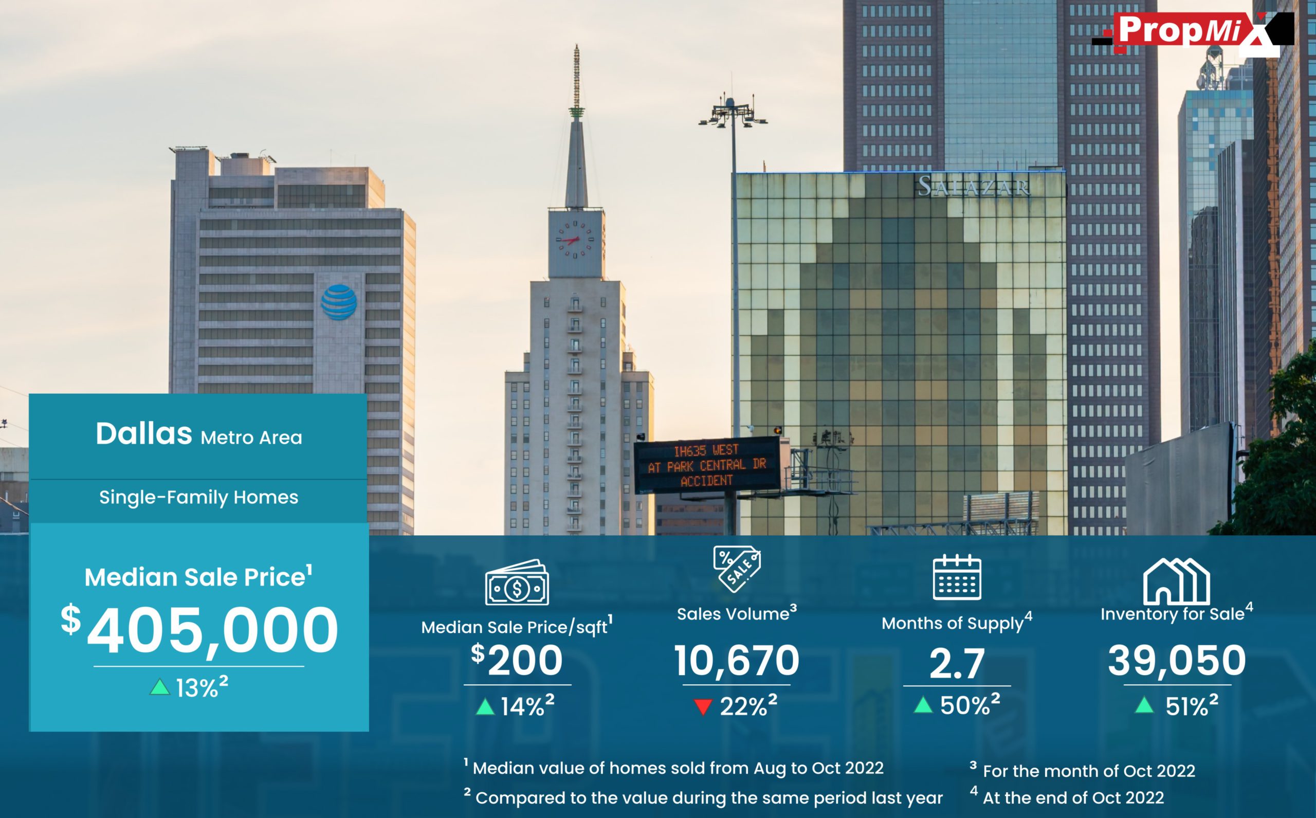 Median Sale Price Up by 13% in Dallas Metro Area in October 2022 11/05/2022 PropMix Data Analytics Team Market Insights 0 The median sale price of single-family homes sold in the Dallas metro area was $405,000 for the period from August to October 2022, up by 13% year-over Learn more about the metrics in PropMix Market Insights.