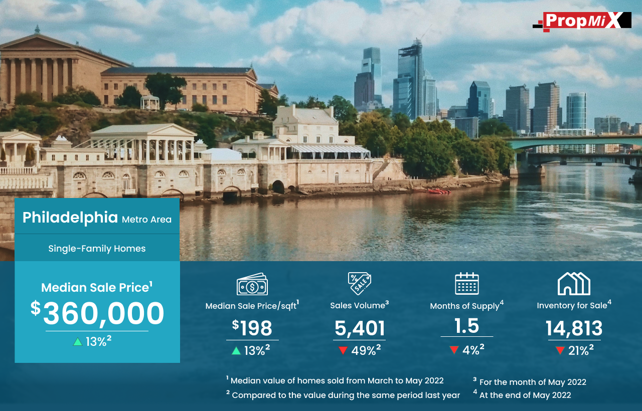 The median sale price of single-family homes sold in the Philadelphia metro area was $360,000 for the period from March to May 2022, up by 13% year-over-year.