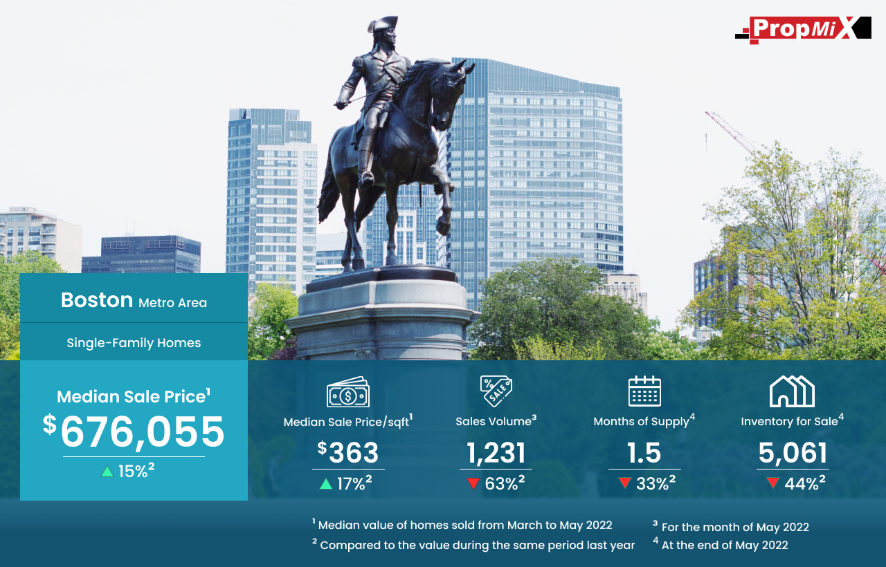 The median sale price of single-family homes sold in the Boston metro area was $676,055 for the period from March to May 2022, up by 15% year-over-year.