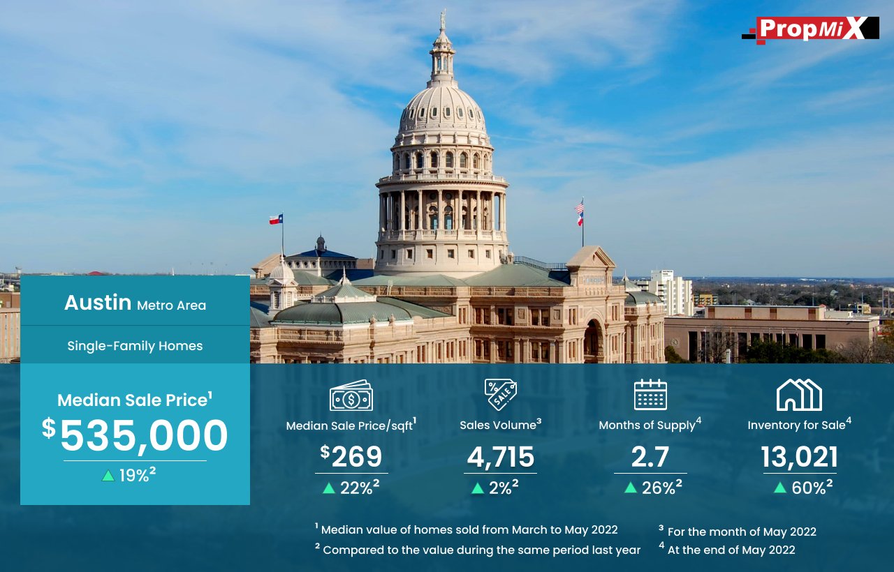 The median sale price of single-family homes sold in the Austin metro area was $535,000 for the period from March to May 2022, up by 19% year-over-year.