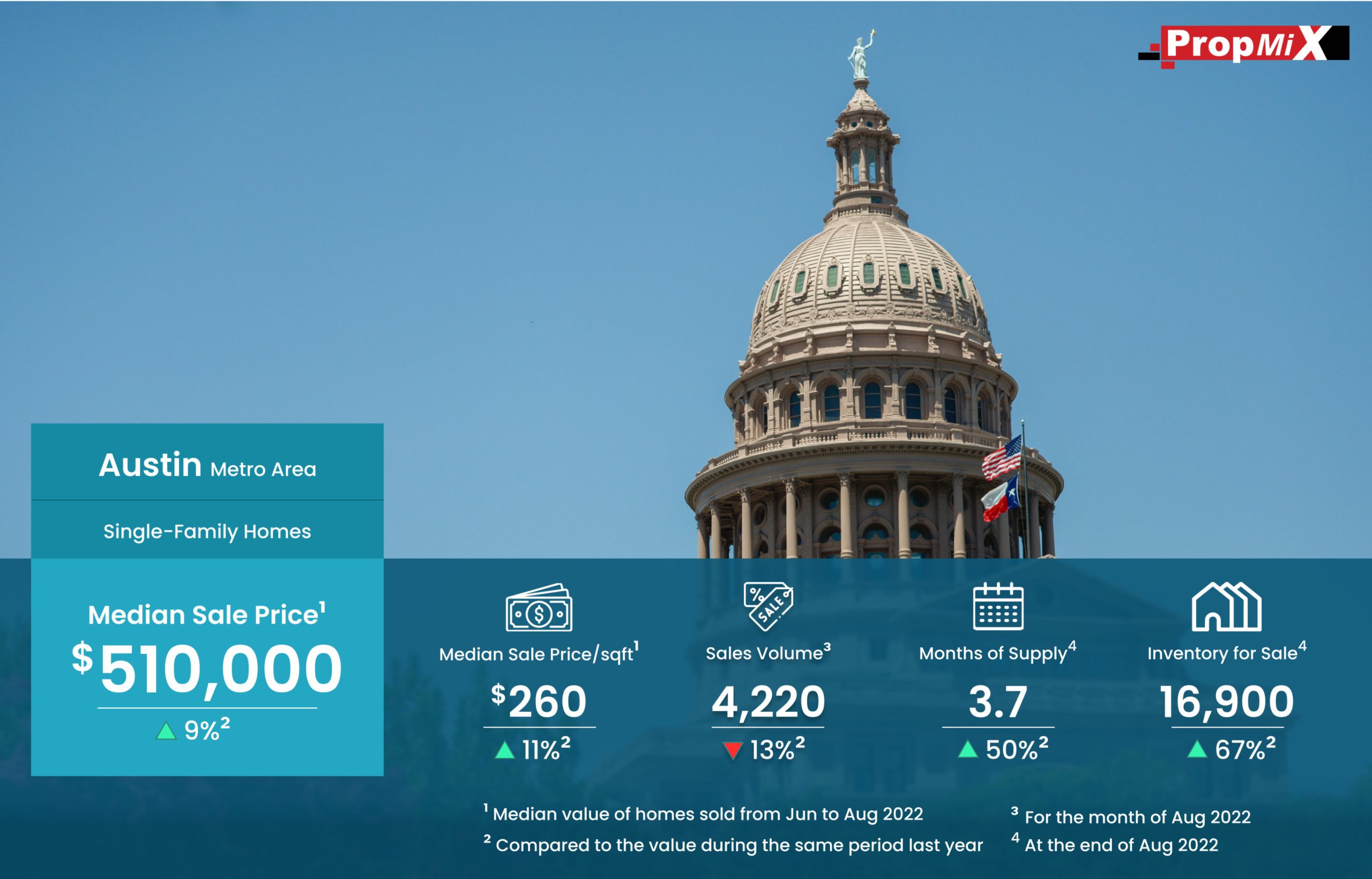 Median Sale Price Up by 9% in Austin Metro Area in August 2022 09/15/2022 PropMix Data Analytics Team Market Insights 0 The median sale price of single-family homes sold in the Austin metro area was $510,000 for the period from June to August 2022, up by 9% year-over-year. Learn more about the metrics in PropMix Market Insights.