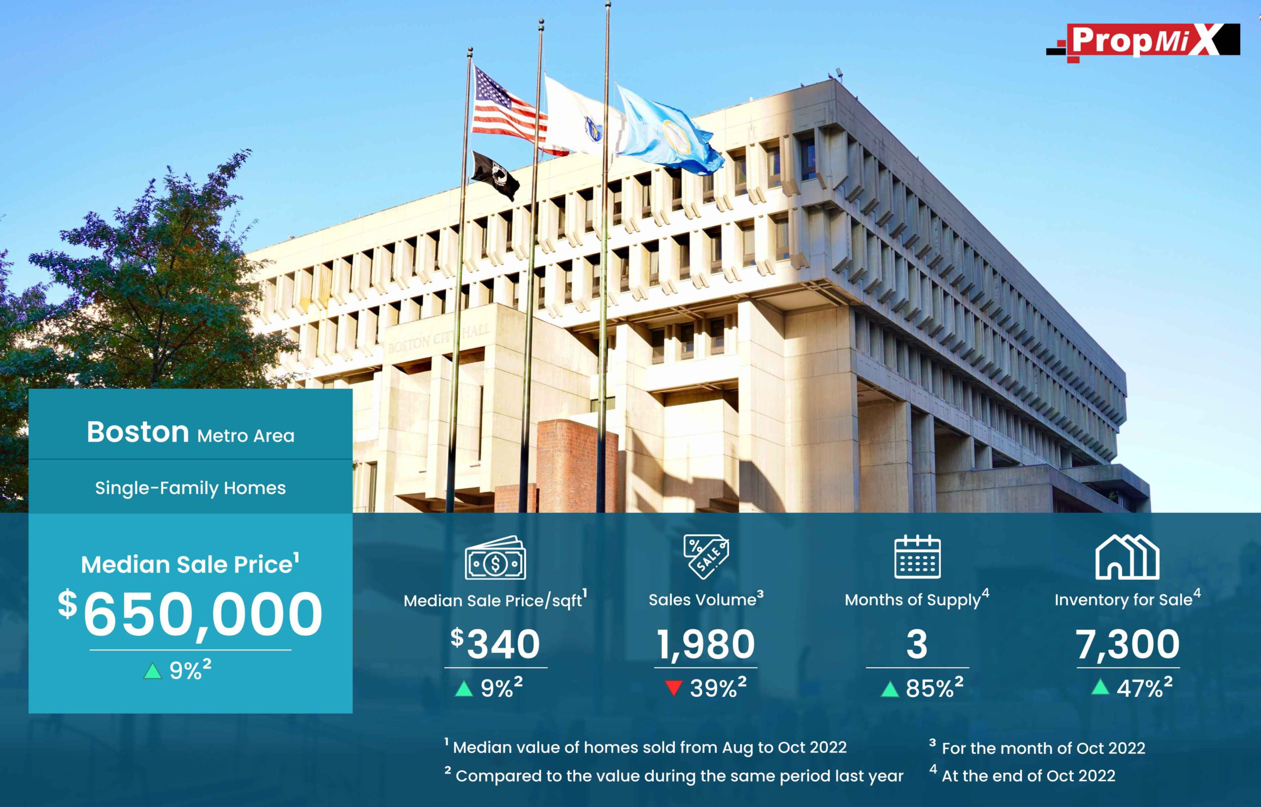 Median Sale Price Up by 9% in Boston Metro Area in October 2022 11/15/2022 PropMix Data Analytics Team Market Insights 0 The median sale price of single-family homes sold in the Boston metro area was $650,000 for the period from August to October 2022, up by 9% year-over-year. Learn more about the metrics in PropMix Market Insights.