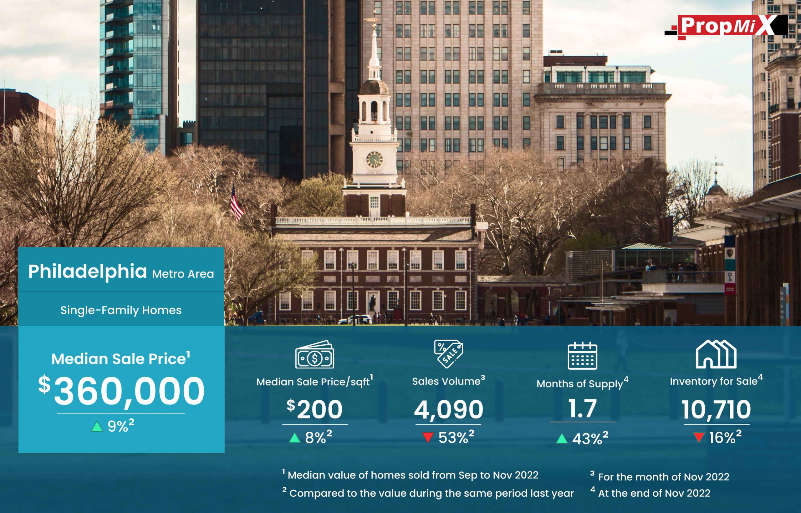 Median Sale Price Up by 9% in Philadelphia Metro Area in November 2022 12/06/2022 PropMix Data Analytics Team Market Insights 0 The median sale price of single-family homes sold in the Philadelphia metro area was $360,000 for the period from September to November 2022, up by 9% year-over-year. Learn more about the metrics in PropMix Market Insights.