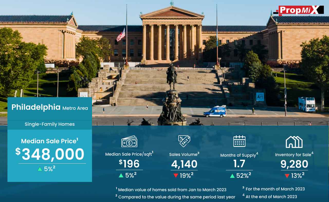 Philadelphia Metro Area Sees 5% Increase in Median Sale Price in March 2023 04/03/2023 PropMix Data Analytics Team Market Insights 0 In Philadelphia metro area, the median sale price has increased to a value of $348,000 during January to March 2023, with a rise of 5% year-over-year. At the same time, inventory for sale in March 2023 has gone down by 13%, when compared to the same peiod last year and having a value of 9,280. Learn more about the metrics in PropMix Market Insights.
