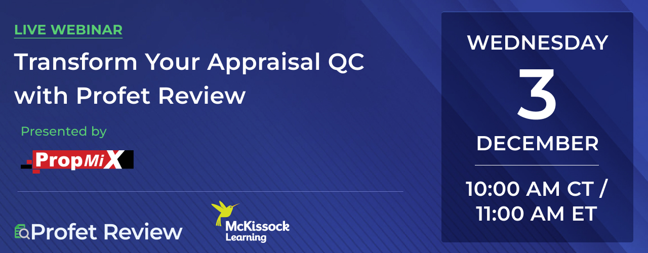 If you missed our recent live webinar, “Transform Your Appraisal QC with Profet Review,” this session, in partnership with McKissock Learning, demonstrated how lenders and AMCs can modernize appraisal quality control using AI-driven automation.