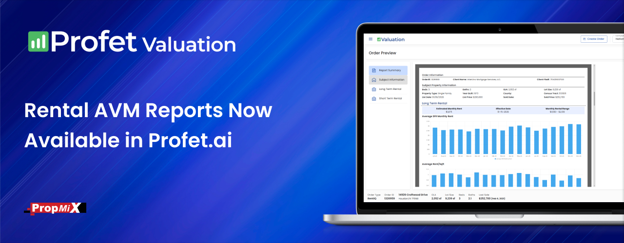 Lenders and AMCs can now order Residential Rental AVM Reports – both Long-Term and Short-Term rental – directly in the Profet platform.