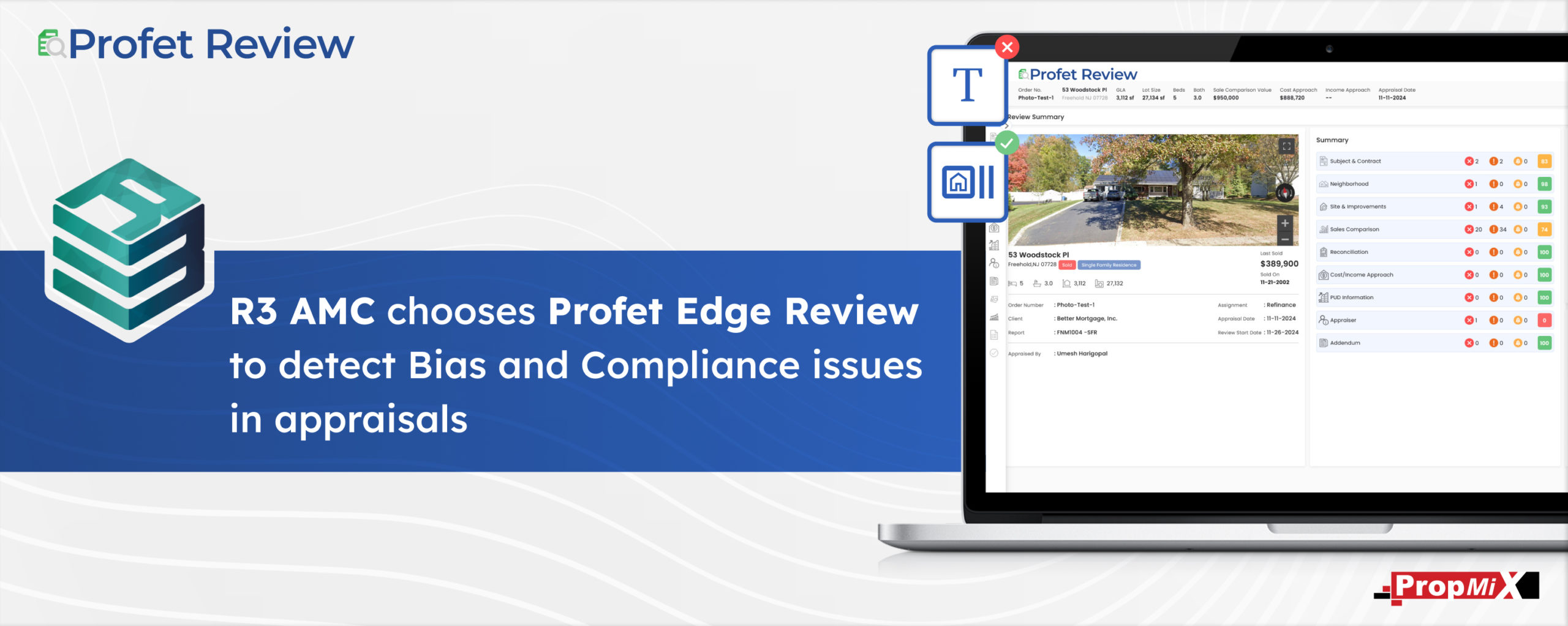 NEW YORK, NY / December 5, 2024 / – R3 AMC, a full service Appraisal Management Company (AMC) focused on helping lenders efficiently navigate the appraisal process, today announced a new appraisal compliance assurance service for lenders wherein every appraisal submitted to lenders is pre-screened for bias and compliance requirements from Fannie Mae and Freddie Mac – the GSEs. R3 AMC has automated this assurance service using PropMix’s Profet Review, an AI-driven valuation quality control platform that includes comparable analysis, natural language processing, and image analysis.