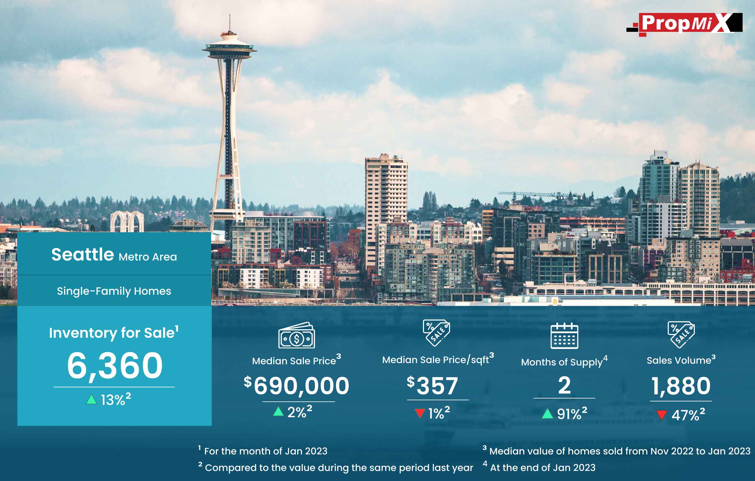 Seattle metro area stood up with a rise of 13 % year-over-year in inventory for sale during November 2022 and January 2023, with a value of 6,360.