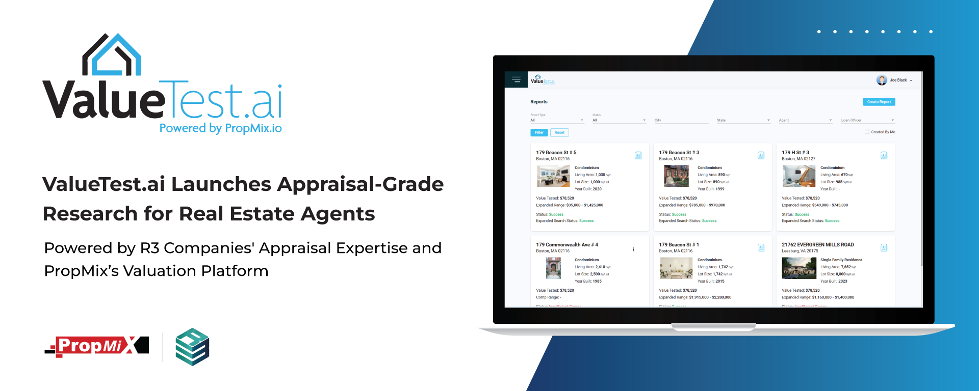 Henderson, NV / January 30, 2024 / – Today, R3 group of companies specializing in appraisal management and reviews and PropMix.io LLC – a leading provider of real estate data and AI driven solutions announced the launch of ValueTest.ai – an online valuation research service for real estate agents powered by a unique combination of appraisal-expertise and AI-based valuation engines. ValueTest.ai helps real estate professionals test a value target for a property using AI-driven comp selection before taking an action.