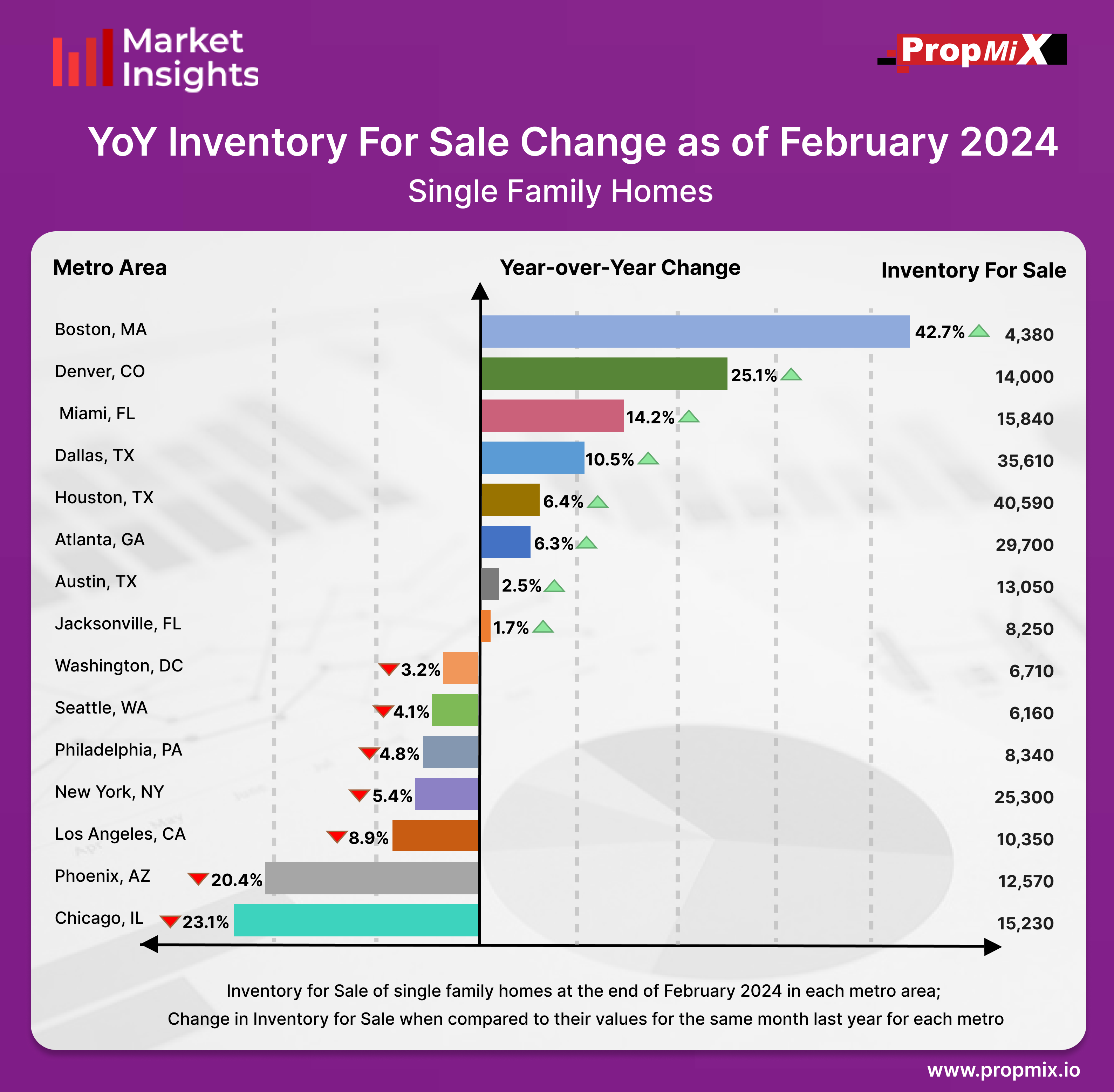 At the end of February 2024, Boston metro area witnessed the highest increase in inventory for sale among the top 15 metro areas, with a rise of 42.7% compared to the end of the same month a year ago. There were 4,380 homes for sale. Meanwhile, during the same time period, Phoenix saw a decline of 20.4% in inventory for sale compared to the end of February 2023, with 12,570 homes listed for sale.