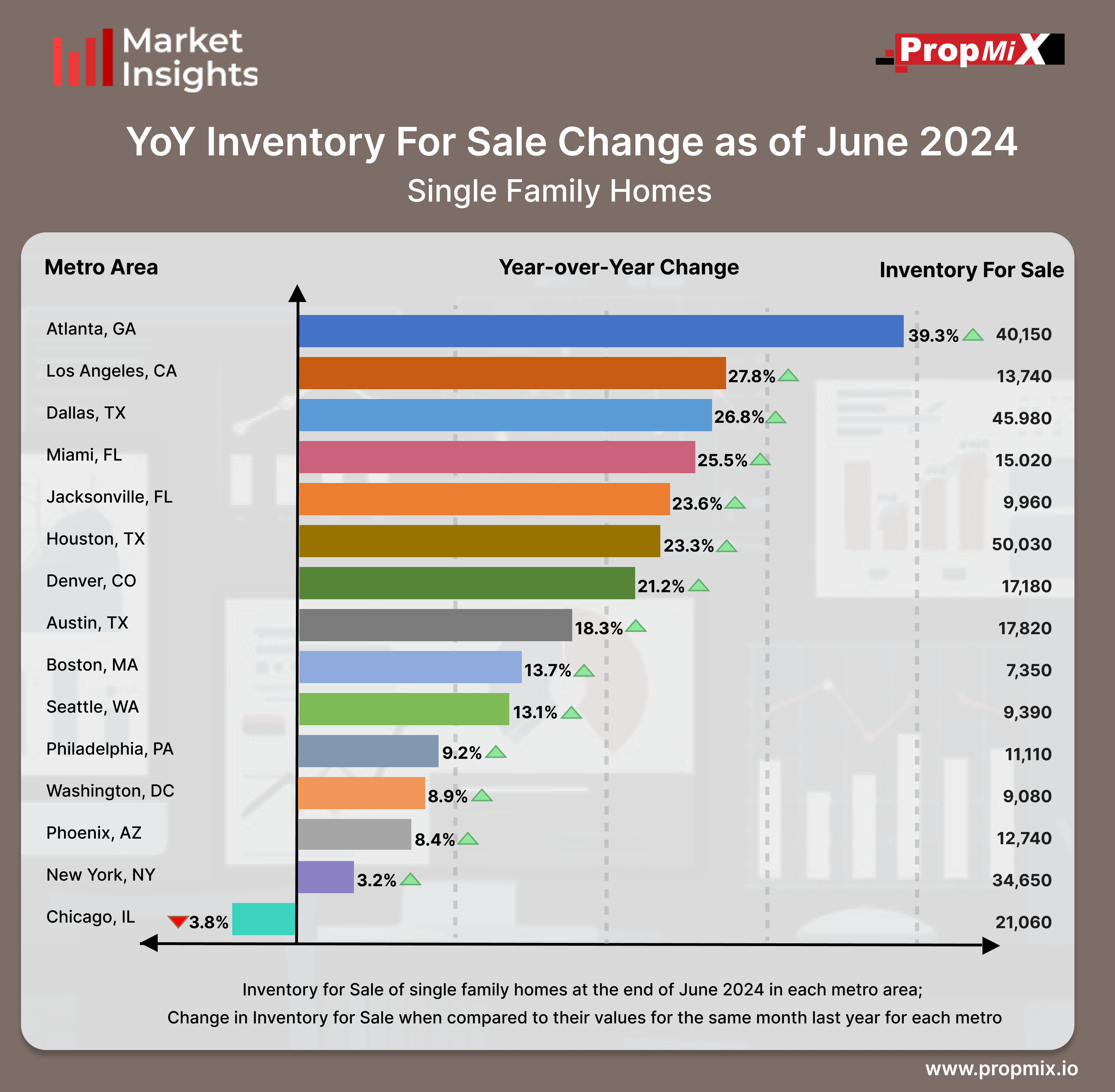 Atlanta metro area experienced the highest YoY change in the inventory for sale by the end of June 2024, across the top 15 metro areas, with an increase of 39.3% compared to the same period last year and an inventory for sale value of 40,150. In contrast, Chicago metro area saw the lowest YoY change, with a decrease of 3.8% and an inventory for sale value of 21,060. The Los Angeles metro area had a substantial YoY increase of 27.8%, followed closely by the Dallas metro area at 26.8% and the Miami metro area at a 25.5% increase in inventory for sale. Metro areas such as Jacksonville, Houston, Denver, and Austin saw a rise in YoY change in inventory for sale ranging from 23.6% to 18.3%. On the lower end, the Boston, Seattle, Philadelphia, and Washington metro areas had more modest increases in YoY change in the inventory for sale ranging from 13.7% to 8.4%. Meanwhile, the New York metro area experienced a 3.2% YoY increase in inventory compared to the same period last year.